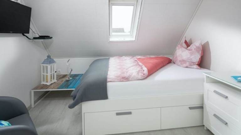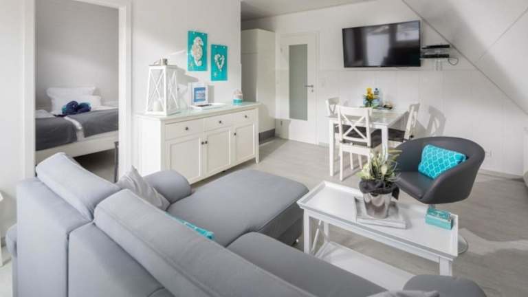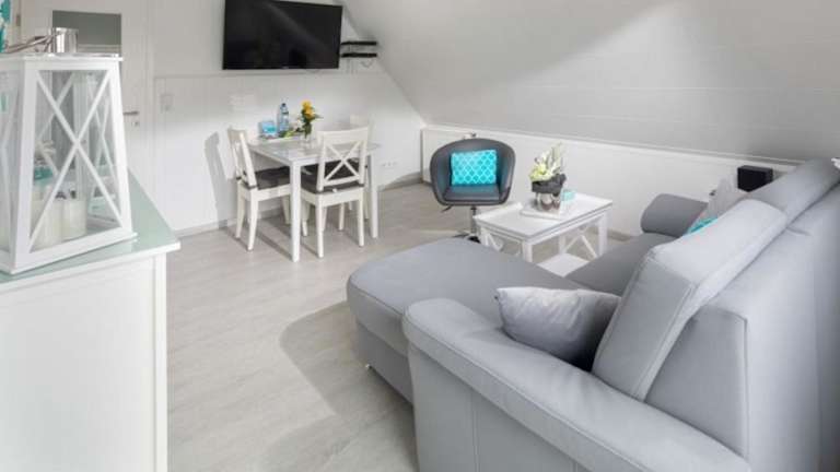 Die Ferienwohnung ist versehen mit einem Flachbild-TV und bietet eine gut ausgestattete Küche. Diese enthält einen Kühlschrank, einen Geschirrspüler, einen Ofen sowie eine Kaffeemaschine und einen Wasserkocher.