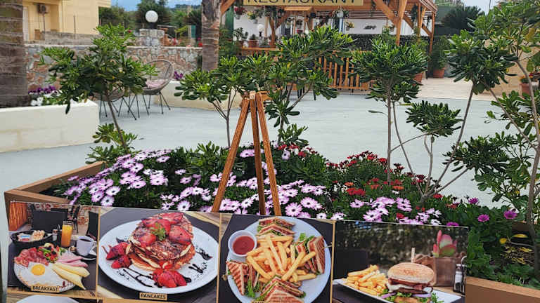 Die Gäste können griechische und mediterrane Gerichte im hauseigenen Restaurant geniessen oder einen Cocktail an der Bar. Zudem bietet die Unterkunft ein à la carte oder kontinentales Frühstück an.