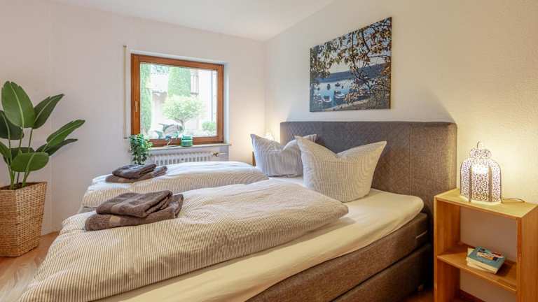 Die Ferienwohnung verfügt über zwei Schlafzimmer, eine Küche mit Kühlschrank und Geschirrspüler sowie ein Badezimmer mit Dusche und Haartrockner. Handtücher und Bettwäsche werden bereitgestellt.