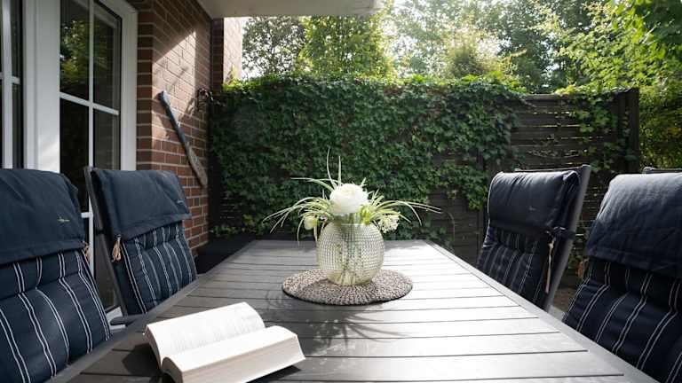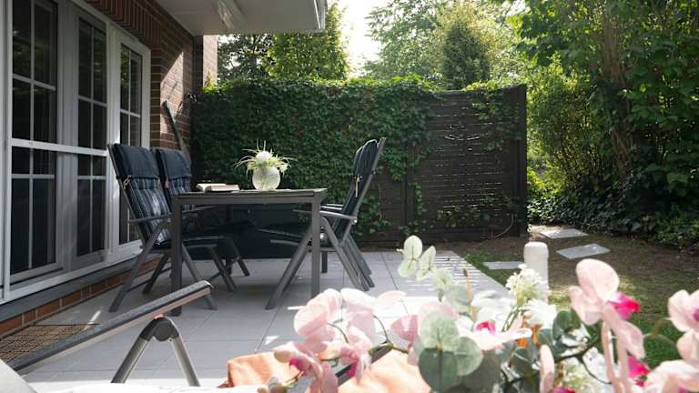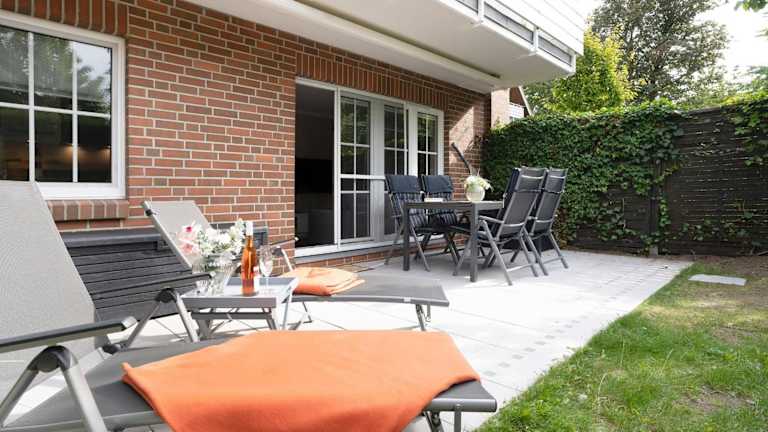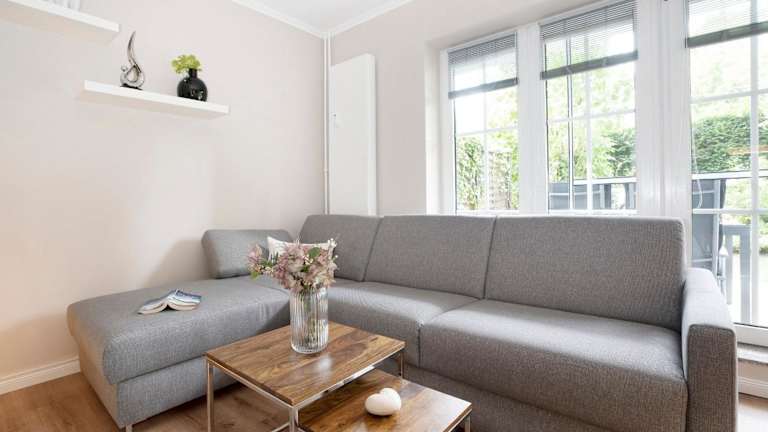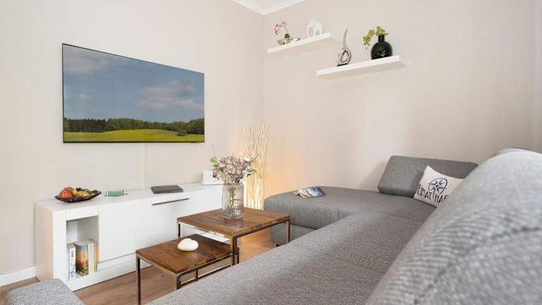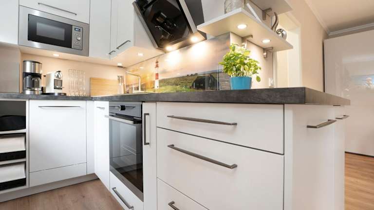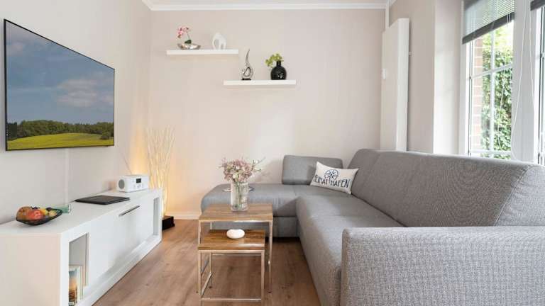 Die Ferienwohnung im Erdgeschoss ist ausgestattet mit einem Schlafzimmer, einer gut ausgestatteten Küche mit Kühlschrank und Geschirrspüler, einem Wohnzimmer sowie einem TV.