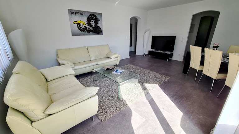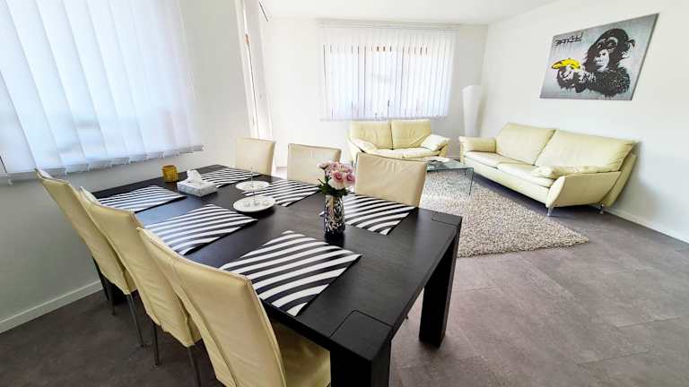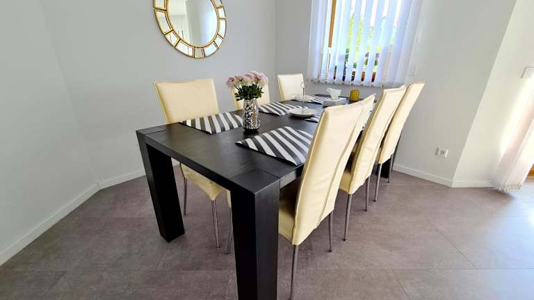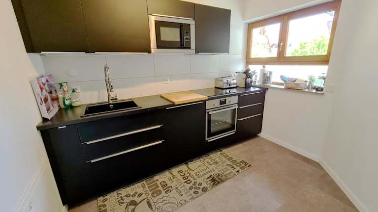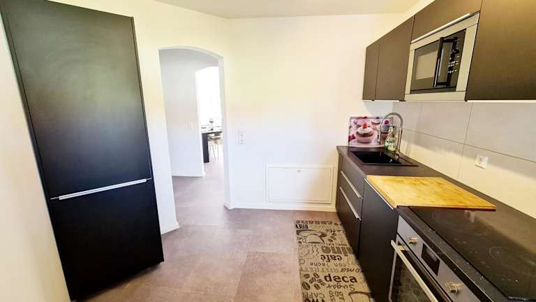 Die Ferienwohnung ist mit einer gut ausgestatteten Küche versehen, die einen Kühlschrank sowie einen Geschirrspüler umfasst. Auch die Möglichkeit, Essenslieferungen in die Unterkunft zu bestellen, steht zur Verfügung, was zusätzlichen Komfort bietet.