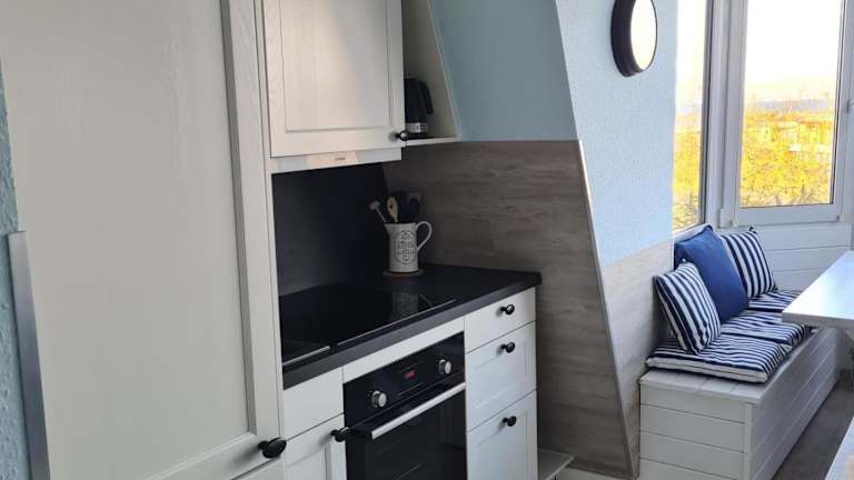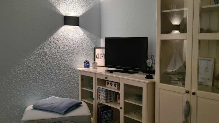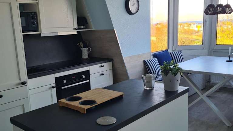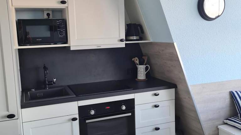 Die Ferienwohnung ist ausgestattet mit einer Küchenzeile, die über einen Kühlschrank, einen Geschirrspüler, einen Ofen sowie eine Kaffeemaschine und einen Wasserkocher verfügt. Ein Kabel-TV ist ebenfalls vorhanden. Gäste haben die Option, ihre eigenen Bettwäsche und Handtücher mitzubringen oder gegen Gebühr zu mieten.