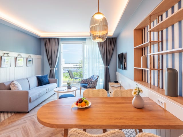 Die Apartments der SEETELHOTEL Ostseeresidenz Heringsdorf verfügen über ein eigenes Bad, eine hochwertig ausgestattete Küche, einen komfortablen Sitzbereich sowie weitere moderne Annehmlichkeiten.