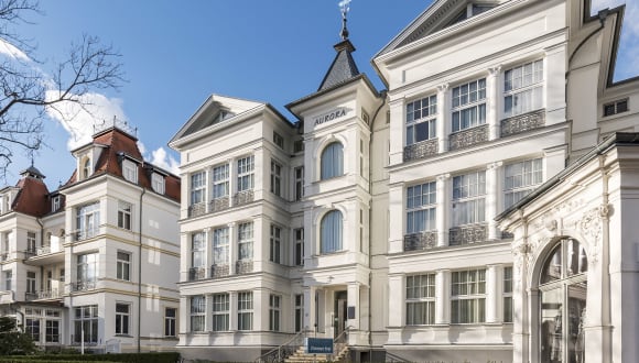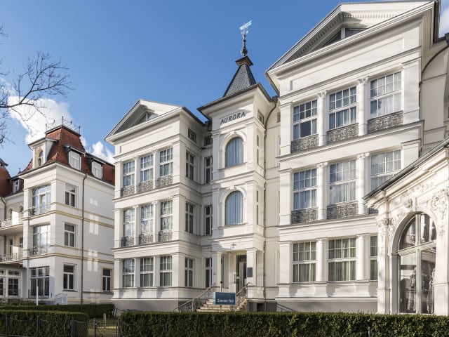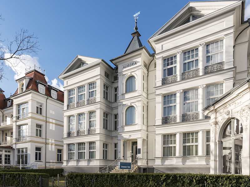 SEETELHOTEL Villa Aurora, Seebad Heringsdorf 1882 erbaut, eine der schönsten Villen im Seebad Heringsdorf auf der Insel Usedom. Nach umfangreicher Rekonstruktion und Sanierung wurde die unter Denkmalschutz stehende Villa Aurora 1996 neu eröffnet. Zentral im Seebad Heringsdorf gelegen aber nur wenige Meter vom feinsandigen Ostseestrand erwarten Sie Ruhe und Erholung. Fernab vom Massentourismus erleben Sie Ferienwohnungen, welche eins gemeinsam haben: ein Höchstmaß an Komfort. Die Einrichtung, die Möbel, die Bilder kommen Ihrem Wunsch nach Gesundheit und Entspannung entgegen. Bei der Sanierung wurde großer Wert auf ökologische Materialien gelegt. Die Residenz der Villa Aurora ist ein dreigeschossiger Neubau, Eröffnung 1998 und bereits 2007 umfangreich modernisiert und erneuert. Die Ferienwohnungen haben einen hohen Standard und zeichnen sich durch ein besonders gutes Preis-Leistungs-Verhältnis aus. Einige Wohnungen sind besonders kinder- und familiengerecht. Das Appartementhaus ist ebenso wie die Villa Aurora ein Nichtraucherhaus. Hund oder Haustiere sind nicht erlaubt. WLAN kostenfrei vorhanden.