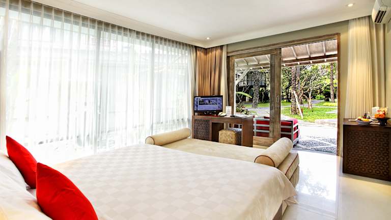 Die Zimmer im Segara Village Hotel sind mit indonesischen Möbeln eingerichtet und bieten einen Balkon oder eine Terrasse mit Garten- oder Poolblick. Zur Zimmereinrichtung gehören Klimaanlage, Minibar, Tee- und Kaffeezubehör, ein TV mit Satellitenempfang sowie kostenfreies Wifi. Die Badezimmer verfügen über eine Dusche und eine Badewanne, Haartrockner, Bademäntel und Kosmetikartikel sind ebenfalls vorhanden. Zudem sind rollstuhlgerechte Zimmer buchbar.