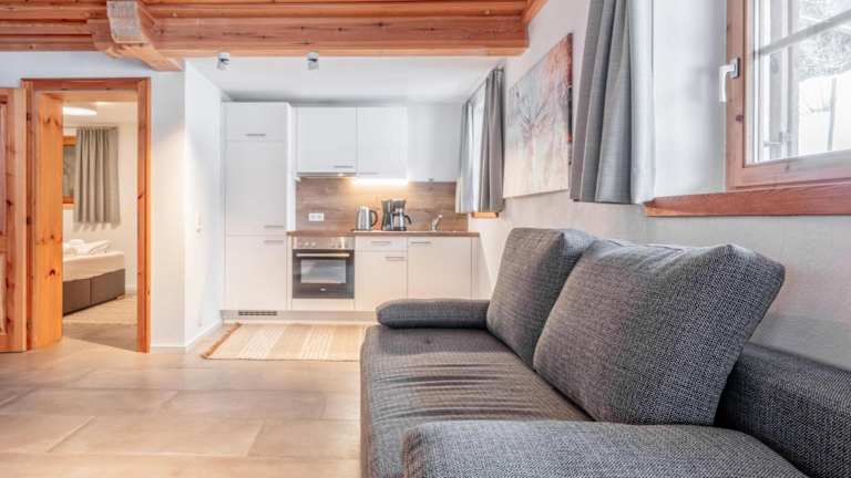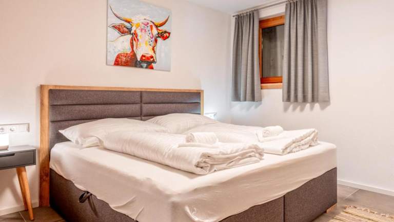 Die Ferienwohnung umfasst 1 Schlafzimmer, eine Küche ausgestattet mit Kühlschrank und Ofen, einen TV, einen Sitzbereich sowie ein Badezimmer mit Dusche. Handtücher und Bettwäsche werden bereitgestellt.