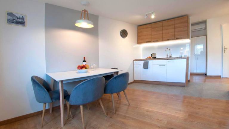 Das Apartment umfasst ein Schlafzimmer sowie ein Wohnzimmer und ist mit einer voll ausgestatteten Küchenzeile versehen, die über einen Kühlschrank und eine Kaffeemaschine verfügt. Das Badezimmer ist mit einer Dusche und einem Haartrockner ausgestattet. Handtücher und Bettwäsche werden bereitgestellt.