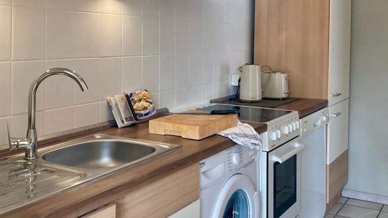 Das Ferienhaus bietet ein Schlafzimmer und ist ausgestattet mit einer Küche, die über einen Kühlschrank und Geschirrspüler verfügt. Ein Flachbild-TV und ein Sitzbereich stehen ebenfalls zur Verfügung. Das Badezimmer hat eine Dusche. Handtücher und Bettwäsche werden in der Unterkunft bereitgestellt.