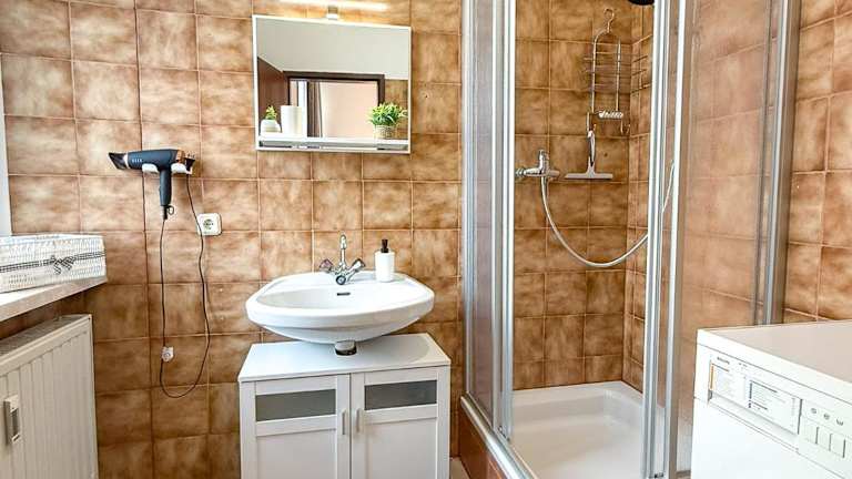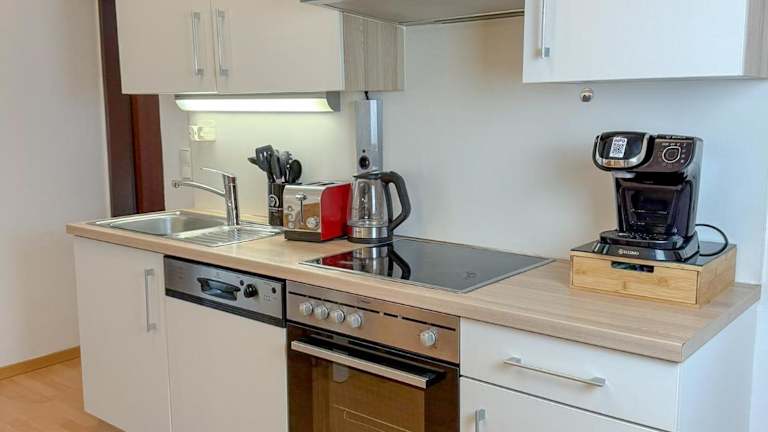 Das Ferienhaus beinhaltet ein Schlafzimmer, eine Küche mit Kühlschrank und Geschirrspüler, sowie ein Badezimmer mit Dusche, Haartrockner und Waschmaschine. Handtücher und Bettwäsche werden bereitgestellt.