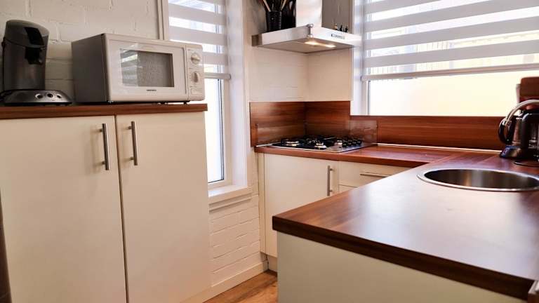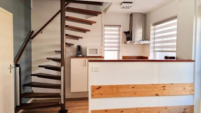 Das Ferienhaus umfasst zwei Schlafzimmer, ein Wohnzimmer und eine voll ausgestattete Küche mit Kühlschrank und Kaffeemaschine. Das Badezimmer ist mit einer Dusche ausgestattet. Handtücher und Bettwäsche werden bereitgestellt.