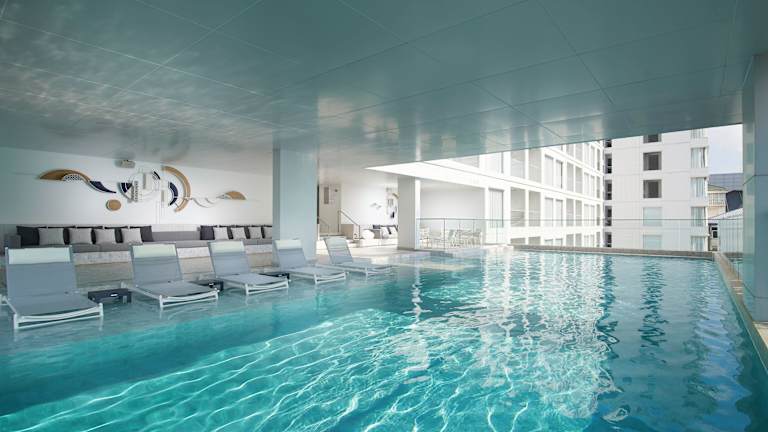 Das Hotel bietet sowohl einen Innenpool als auch einen Aussenpool, die sich ideal für Aktivität und Aquatraining eignen. Eine Sonnenterrasse lädt zum Entspannen ein, während ein Fitnessstudio und die Möglichkeit für Aerobic zusätzliche Optionen für sportliche Betätigung bieten. Zudem ist ein Kinderspielplatz vorhanden.