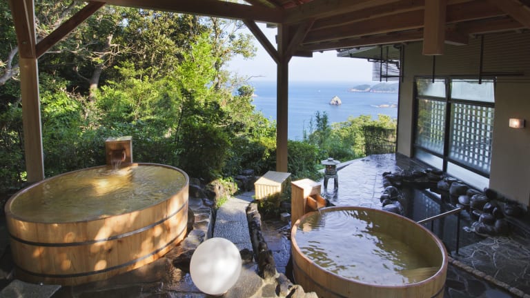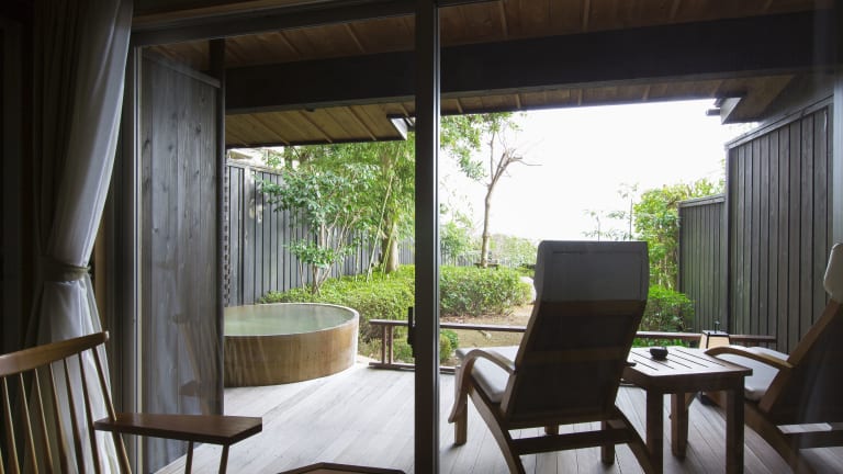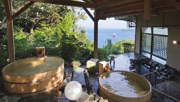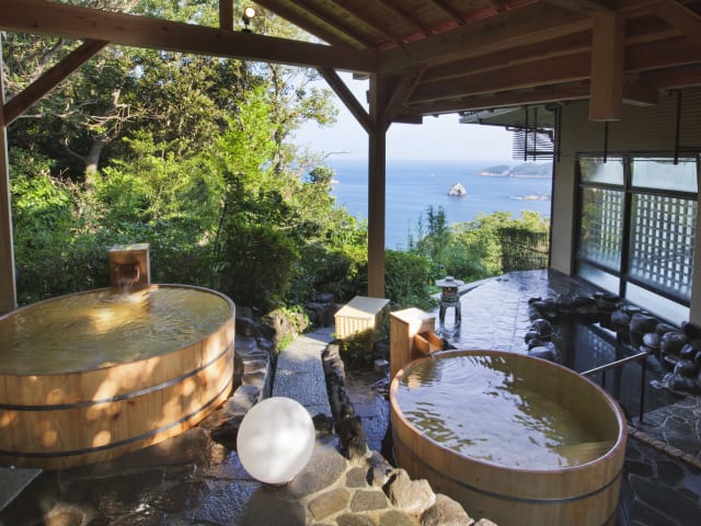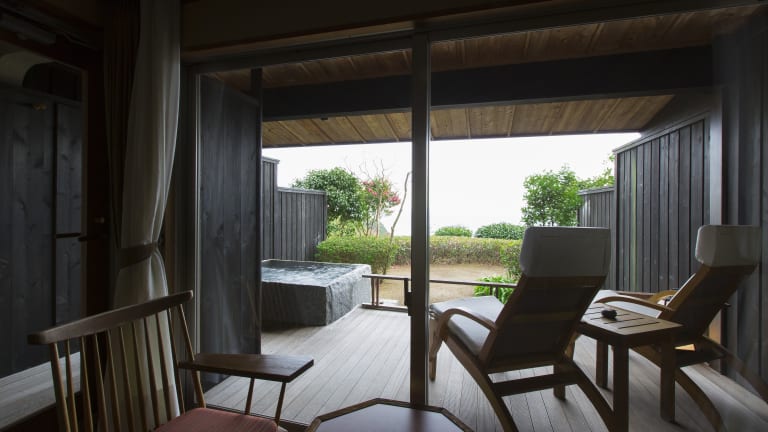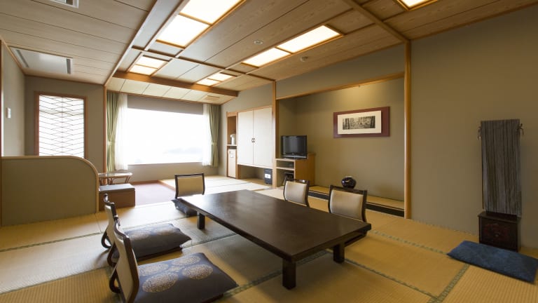 Die hellen Zimmer sind im traditionellen japanischen Stil mit Tatamiböden und Futonbetten ausgestattet. Zu den Annehmlichkeiten zählen ein LCD-TV, ein Kühlschrank, eine Tee-/Kaffeemaschine und ein eigenes Bad mit Dusche und Badewanne. Gäste dürfen sich auf einen Balkon oder eine Terrasse mit Meerblick freuen. Hausschuhe und Yukata-Kimonos sind ebenfalls vorhanden. Es gibt sowohl Familienzimmer als auch Nichtraucherzimmer.