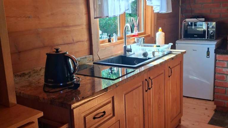 Das Ferienhaus hat 1 Schlafzimmer, 1 Badezimmer mit Dusche und bietet Handtücher sowie Bettwäsche. Die Küchenzeile ist mit einem Kühlschrank und einer Herdplatte ausgestattet.