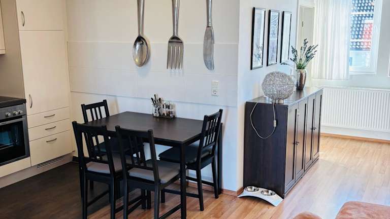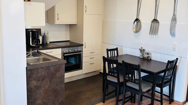 Die Ferienwohnung verfügt über ein Schlafzimmer, einen Flachbild-TV und eine gut ausgestattete Küchenzeile mit Kühlschrank und Toaster. Ein Badezimmer mit Dusche ist ebenfalls vorhanden.