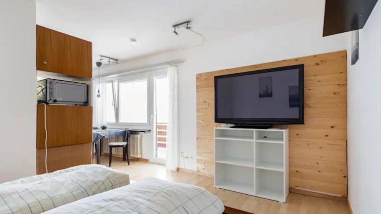 Die Unterkunft umfasst ein Schlafzimmer und eine moderne Küche mit Kühlschrank und Geschirrspüler. Ein Flachbild-TV ist ebenfalls vorhanden. Handtücher und Bettwäsche werden gestellt. Die Ferienwohnung ist ein Nichtraucherzimmer und erlaubt keine Haustiere.