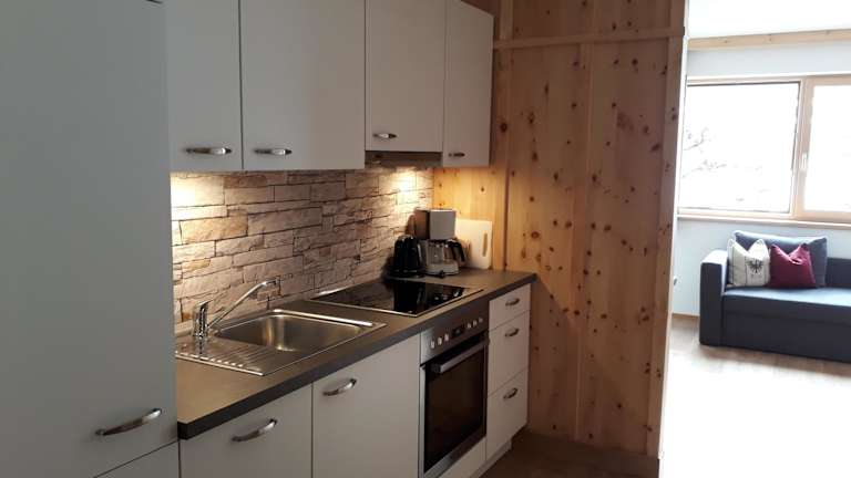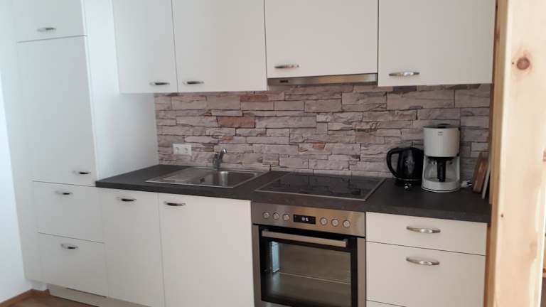 Die Küche der Unterkunft ist ausgestattet mit einem Kühlschrank, einem Geschirrspüler, einem Ofen sowie einer Herdplatte. Zudem stehen eine Kaffeemaschine und ein Wasserkocher bereit.