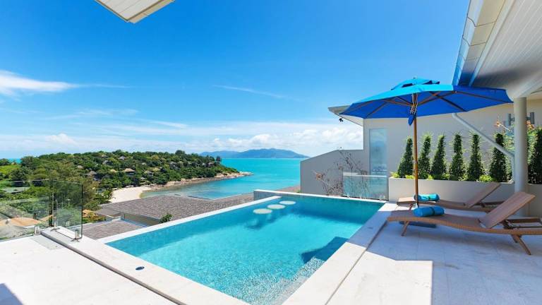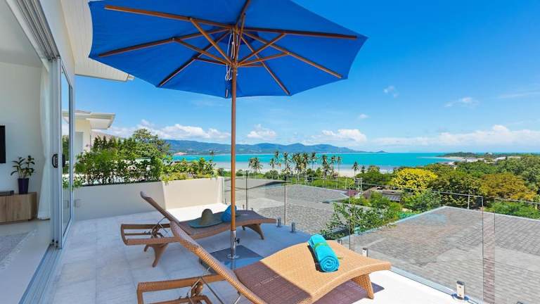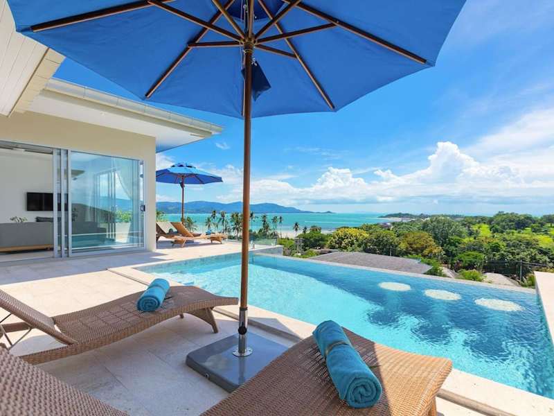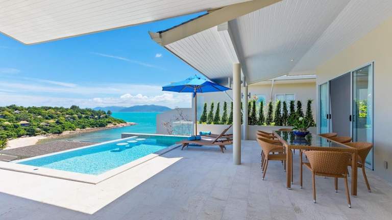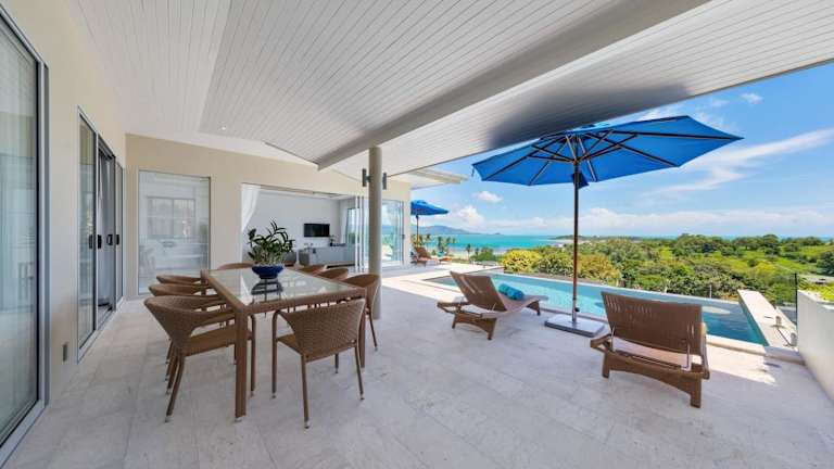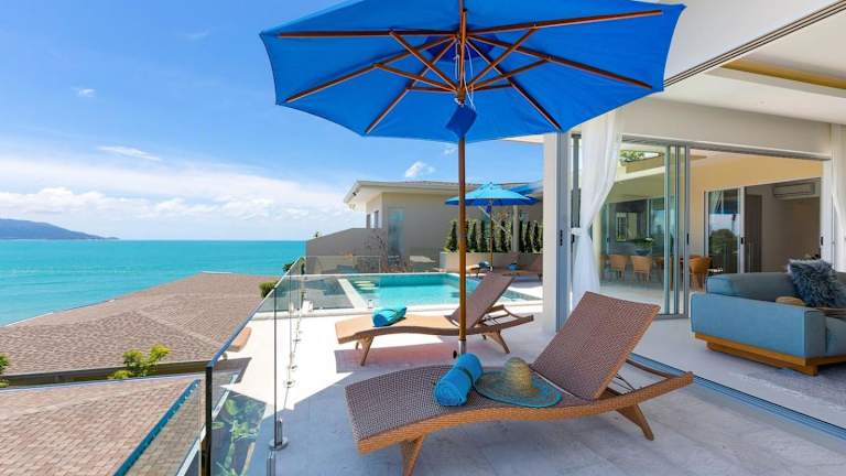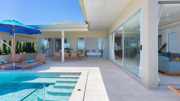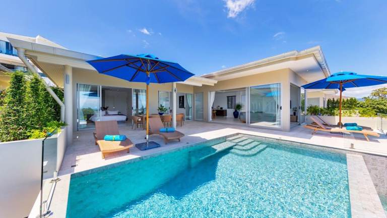 Die Single Level BEACHSIDE VILLA - BB2 - im BAYSIDE LUXURY VILLAS Samrong Bay Beach bietet eine idyllische Lage mit Meerblick und Sonnenuntergang. Die Villa ist ausgestattet mit 3 Schlafzimmern und 4 Badezimmern. Zu den Annehmlichkeiten gehören ein Aussenpool, ein Garten und ein eigener Strandbereich sowie kostenloses WLAN und ein kostenloser Shuttle-Service.