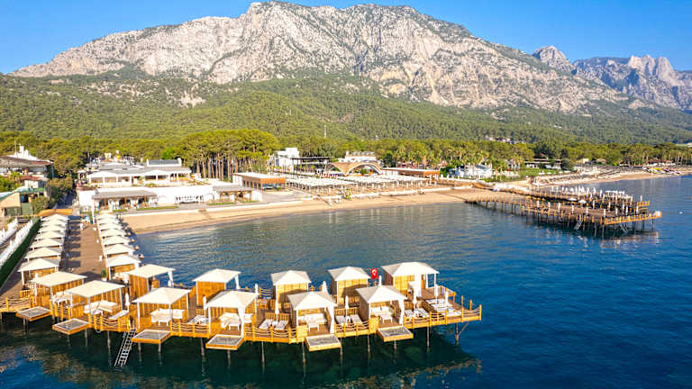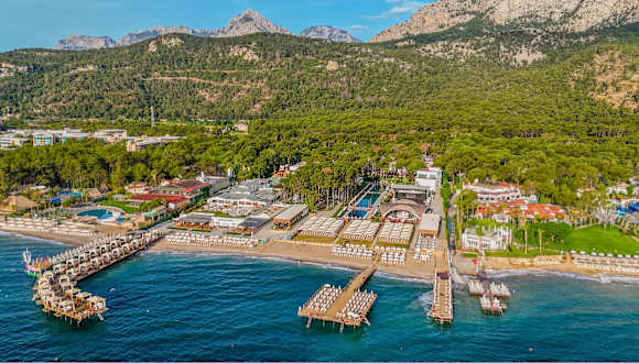 Die 5 Sterne Ultra All Inclusive Club Anlage befindet sich mit direkter Strandlage am Fuße der Beydağları (Herrenberge) in der Ortschaft Beldibi, an der Türkischen Riviera. Charakteristisch für die Region Beldibi ist die wunderschöne Landschaft geprägt von der Vereinigung des mächtigen Taurusgebirges mit dem beruhigendem blau des Mittelmeeres. Zahlreiche Pinienbäume, welche auch innerhalb der Club Anlage eine angenehme Atmosphäre schaffen, vermitteln der Region Beldibi unter anderem ihre Besonderheit. Antike Sehenswürdigkeiten in der näheren Umgebung bieten eine angenehme kulturelle Abwechslung zur Erholung am Strand und an der großzügig angelegten Poollandschaft. Empfehlenswert für Naturfreunde ist zum einen der Spaziergang im Göynük Canyon (ca. 12 km vom Hotel entfernt) und zum anderen der Besuch der Beldibi Höhle (ca. 6 km vom Hotel entfernt – Zugang zur Höhle über das Meer).