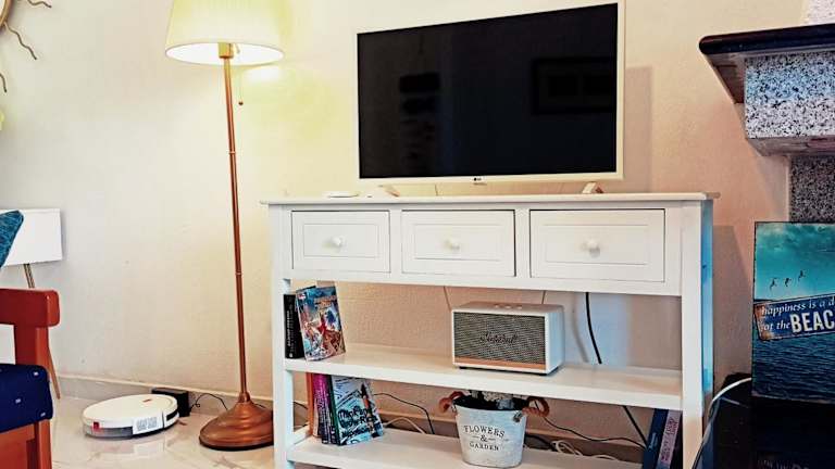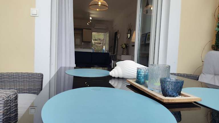 Das Ferienhaus verfügt über zwei Schlafzimmer, ein Wohnzimmer und eine voll ausgestattete Küche mit Kühlschrank und Kaffeemaschine. Ein Badezimmer mit Dusche und Haartrockner gehört ebenfalls zur Ausstattung. Handtücher und Bettwäsche werden bereitgestellt. Weitere Annehmlichkeiten umfassen Klimaanlage, Heizung und Zugang zu einem Balkon mit Gartenblick.
