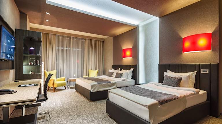 Die elegant eingerichteten Zimmer sind klimatisiert und verfügen über einen Balkon mit Blick auf den Poolbereich. Zur Ausstattung gehören ein Safe, eine Minibar, eine Tee-/Kaffeemaschine, ein TV-Gerät sowie kostenloses Wifi. Die Badezimmer sind mit Dusche oder Badewanne, Haartrockner und kostenlosen Pflegeprodukten ausgestattet. Das Hotel bietet auch rollstuhlgerechte Zimmer sowie Familien- und Nichtraucherzimmer an.