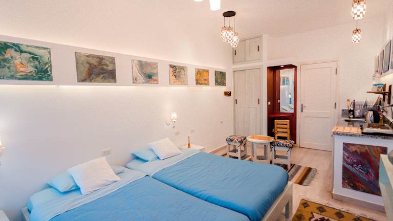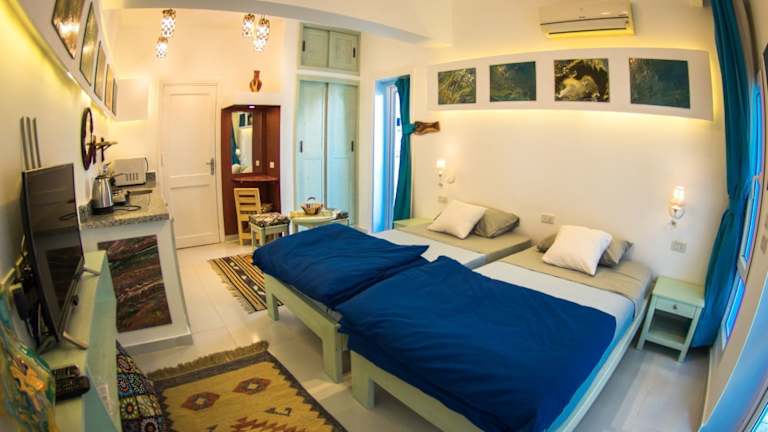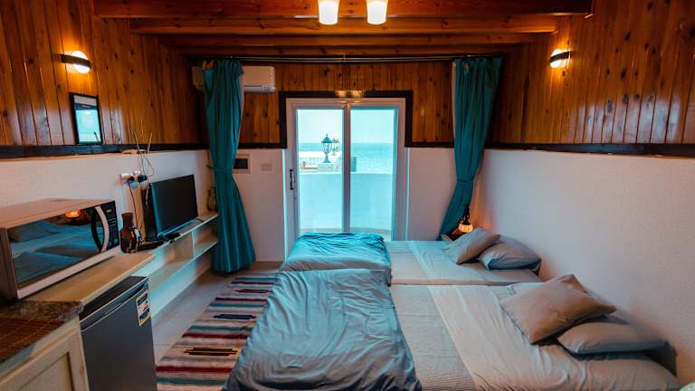 Die klimatisierten Zimmer im Skyrock Dahab sind komfortabel und bieten eine Terrasse oder einen Balkon mit herrlichem Blick auf das Meer und die Berge. Jedes Zimmer verfügt über einen gemütlichen Sitzbereich, einen Flachbild-Sat-TV und eine praktische Küchenzeile mit Kühlschrank, Mikrowelle, Kochfeld und Wasserkocher.