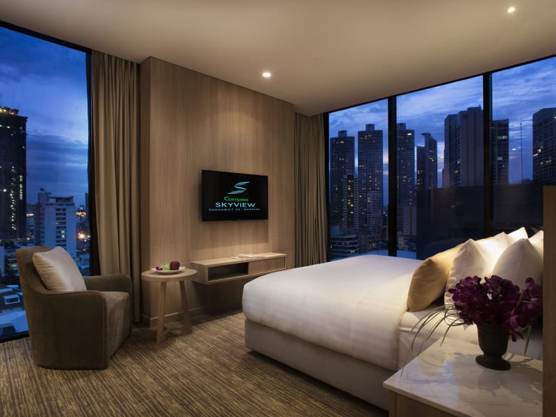 ROOMS & SUITES Spacious and stylish accommodations in a top Bangkok location Compass SkyView Hotel boasts 285 thoughtfully designed modern guestrooms each featuring a harmonious color palette and plenty of natural light. Included in the array are 47 sophisticated serviced apartments – our Sky Grand and Sky Executive Suites. Fully loaded with LED TV and high-speed Wi-Fi access, not to mention the well-stocked bar in the fridge and IDD telephone, these spaces quickly become a relaxing and fulfilling home away from home. Take a seat upon comfortable furnishings, experience the hi-tech amenities, and absorb the user-friendliness of the entire hotel. Each guestroom and suite is this a very welcome spot to return to after an exciting day exploring Bangkok.