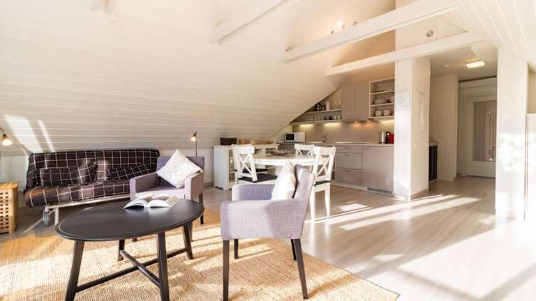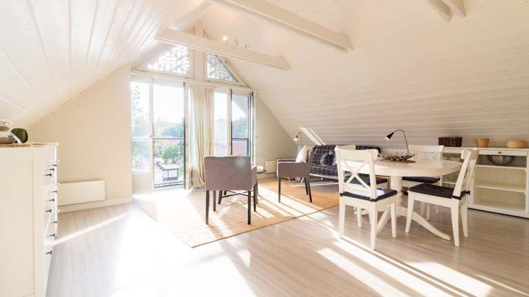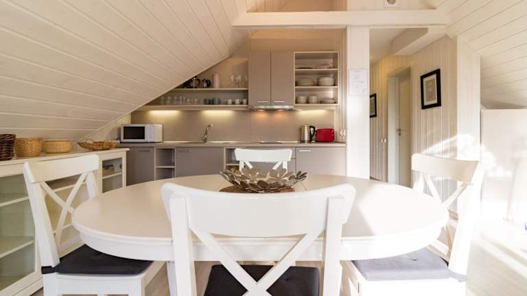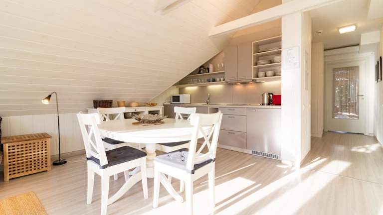 Die Ferienwohnung ist ausgestattet mit einer Küchenzeile, einem Kühlschrank und einer Mikrowelle. Ein Badezimmer mit Dusche, Haartrockner und Waschmaschine ist ebenfalls vorhanden. Handtücher und Bettwäsche werden zur Verfügung gestellt.
