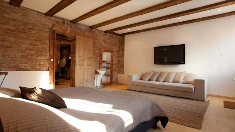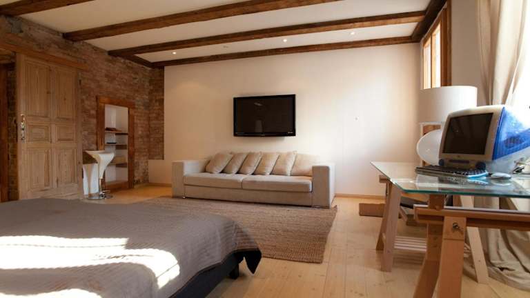 Die Wohnung verfügt über zwei Schlafzimmer, eine gut ausgestattete Küchenzeile mit Kühlschrank und Ofen sowie ein Wohnzimmer. Zur Ausstattung gehört auch ein Flachbild-TV. Familienzimmer sind verfügbar und es können Zustellbetten für Kinder und Erwachsene geboten werden, wobei Gebühren anfallen können.