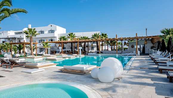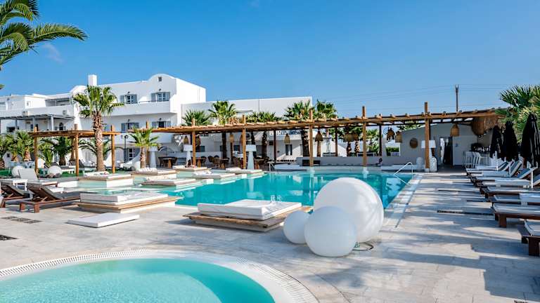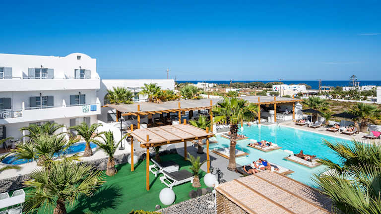 Das Hotel befindet sich im Ort Monolithos, etwa 200 m vom Sand- und Kiesstrand von Kamari entfernt und ca. 9 km vom Stadtzentrum von Fira.