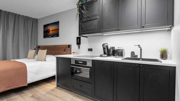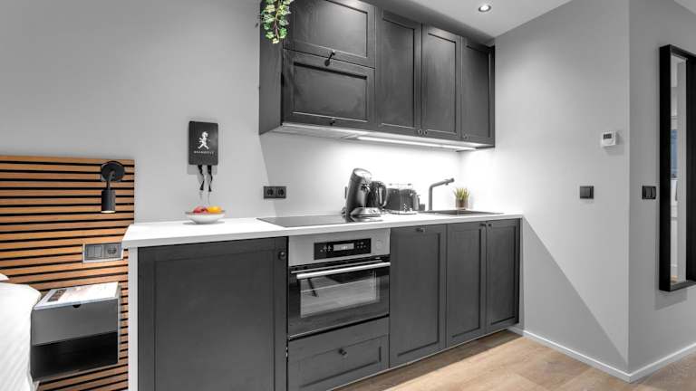 In den Apartments sind die Gäste in der Lage, selbst zu kochen und ihre Mahlzeiten in der voll ausgestatteten Küche zuzubereiten. Es stehen ein Kühlschrank, Geschirrspüler, Herdplatte, Toaster, Kaffeemaschine und Wasserkocher zur Verfügung, sodass die Gäste ihre eigenen kulinarischen Wünsche erfüllen können.