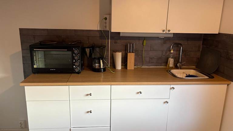 Das Ferienhaus bietet ein gemütliches Schlafzimmer mit einem komfortablen Bett. Zur Ausstattung gehört ein Flachbild-TV, eine komplett ausgestattete Küchenzeile mit Kühlschrank und Backofen sowie eine Waschmaschine. Das Badezimmer verfügt über eine Dusche. Handtücher und Bettwäsche können gegen Aufpreis bereitgestellt werden.