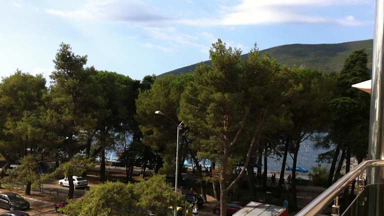 Die Ferienwohnung ist klimatisiert und umfasst zwei Schlafzimmer, ein Wohnzimmer sowie eine voll ausgestattete Küche mit Kühlschrank und Wasserkocher. Ein Badezimmer mit Dusche sowie ein Balkon mit Blick auf die Berge und das Meer bieten zusätzlichen Komfort. Handtücher und Bettwäsche werden bereitgestellt.