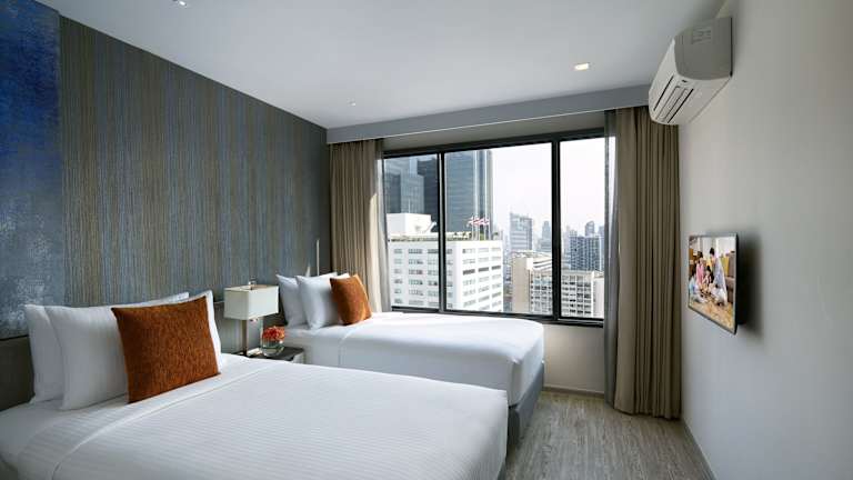 Die Zimmer sind mit Klimaanlage, Doppelbett oder Schlafsofa sowie modernen Annehmlichkeiten wie Safe, Minibar und Flachbild-TV ausgestattet. Jedes Zimmer bietet ein eigenes Badezimmer mit Haartrockner und Pflegeprodukten sowie kostenfreies Wifi. Zusätzliche Bequemlichkeiten wie ein Kühlschrank und ein Bügelset runden das Angebot ab. Familien- und Nichtraucherzimmer sind vorhanden.