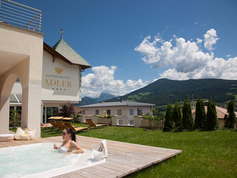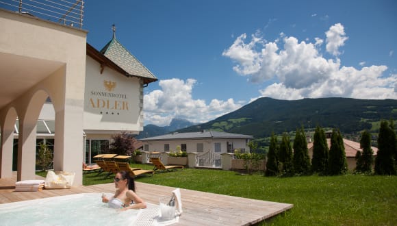 Das familiär geführte Adults-only Sonnenhotel Adler**** liegt im historischen Ortskern von Villanders mit herrlichem Blick auf die Dolomiten. Es ist der ideale Ausgangspunkt für Erkundungen in ganz Südtirol. Viele Highlights, wie die Villanderer Alm, der Barbianer Wasserfall, das Kloster Säben, das Schloss Velthurns oder die Trostburg liegen in unmittelbarer Nähe. Auf der Villanderer Alm, der zweitgrößten Hochalm Europas, erwarten Sie herrliche Panorama-Wanderwege bei traumhafter Bergkulisse. Ein Mal wöchentlich veranstalten wir auf unserer hoteleigenen Alm die allseits beliebte Grillfeier mit Musik vom Juniorchef Walter. Auch Wellness-Fans werden im Sonnenhotel Adler glücklich: Im neugestalteten Adler Naturspa sorgen unter anderem eine großzügige Saunalandschaft, ein lichtdurchflutetes Panorama-Hallenbad sowie vielseitige Anwendungen für Wohlgefühl pur. Hotelgäste können nach einem erfüllten Urlaubstag die meisterhaft zubereiteten Gaumenfreuden vom Juniorchef Reinhold genießen. Das schmackhafte Fleisch kommt vom eigenen Bauernhof, die duftenden Kräuter und das wohlschmeckende Gemüse vom hauseigenen Garten. Erlesene Weine runden das Ganze noch ab. Nutzen Sie die interessanten Angebote mit vielen Inklusiv-Leistungen auf unserer Homepage: www.sonnenhotel-adler.com