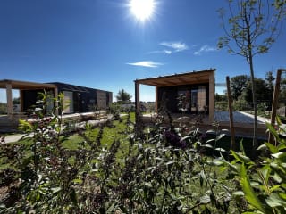 Zwei getrennte Schlafzimmer, 1x mit Doppelbett (160x200 cm) und 1x mit zwei Einzelbetten (je 80x200 cm) mit gepolsterten Kopfteilen, hochwertigen Matratzen, kuscheliger Bettwäsche, Kleiderschränken, Nachtkästchen, LED Leselampen, auf Wunsch bzw. bei Bedarf mit einem Gitterbett. Großzügiger Wohnbereich mit Panoramafenster, Garderobe im Eingangsbereich, Design-Sitzgruppe mit ausziehbarer Couch (zusätzlicher Kinderschlafplatz!), großer Esstisch inkl. bequemer Bestuhlung, Ambiente LED Beleuchtung, 55“ LED TV, WLAN, Gelsengitter bei allen Fenstern und Türen, Verdunkelungsvorhänge, direkter Zugang zur Sonnenterrasse. Voll ausgestattete moderne Küche mit hochwertigen Geräten und Geschirr, Induktionskochfeld (4 Felder), Backofen, Mikrowelle, Dunstabzug, Geschirrspüler, Edelstahl-Spüle, Kühlschrank mit Tiefkühlfach, Mülltrennsystem, Kaffeemaschine der Marke „Tchibo“ inkl. Kapseln, Wasserkocher, Geschirr für 5 Personen. Luxuriöses Badezimmer mit Regen-Dusche, Waschbecken, WC, Fön, Handtuchwärmer, inkl. Hand- und Badetücher plus kuscheliger Bademäntel. Funktionelle Baby- & Kinder-Ausstattung: Gitterbett, Baby-Badewanne, Leih-Kinderwagen, Kinderhochsitz, WC-Aufsatz, Treppchen. Großzügige Sonnenterrasse (28 m²), davon 13 m² beschattet, inkl. chilliger Gartenmöbel (Tisch, Stühle, Liegestühle). Moderne Klima- & Heiztechnik mit verstellbarer Klimaanlage, elektrischer Fußbodenheizung in allen Räumen, IR-Heizsystem.