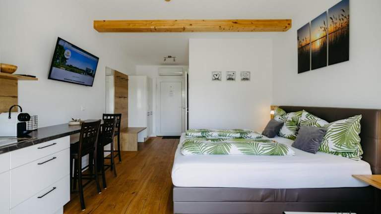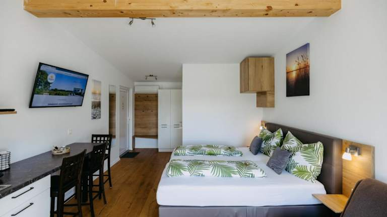 Die Wohneinheiten sind klimatisiert und verfügen über ein eigenes Badezimmer, einen Flachbild-TV, einen Schreibtisch sowie eine voll ausgestattete Küchenzeile. Die Appartements bieten zudem einen Kühlschrank, Geschirrspüler, Ofen, Kaffeemaschine und Wasserkocher. Ein Balkon mit Bergblick ist ebenfalls vorhanden.