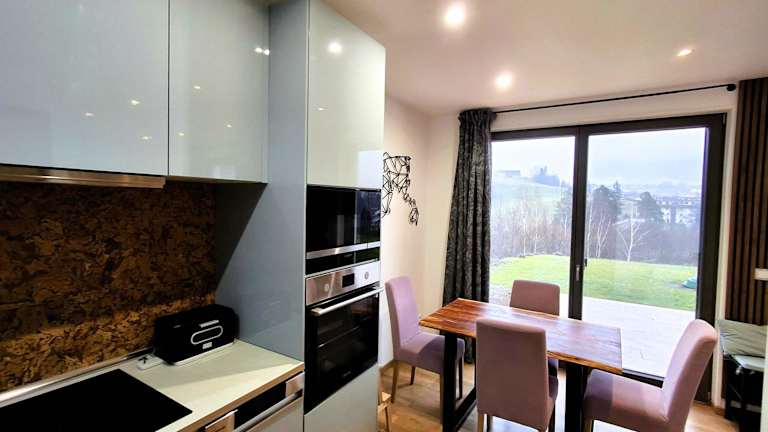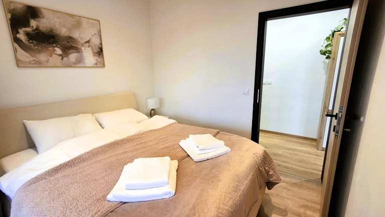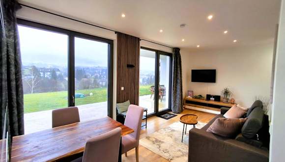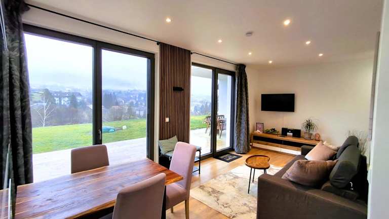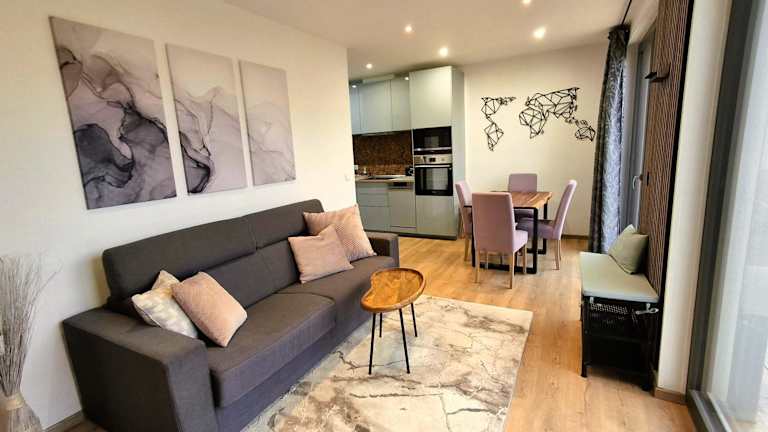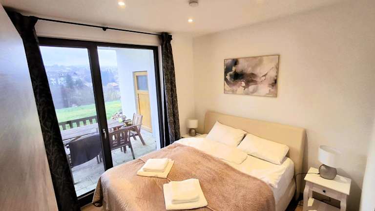 Das Apartment verfügt über ein Schlafzimmer, ein Wohnzimmer mit einem Flachbild-TV und ein Badezimmer mit einer Badewanne oder Dusche. Handtücher und Bettwäsche sind bereitgestellt. Gästen steht eine Terrasse mit Bergblick zur Verfügung, die eine heimelige Atmosphäre ergänzt.