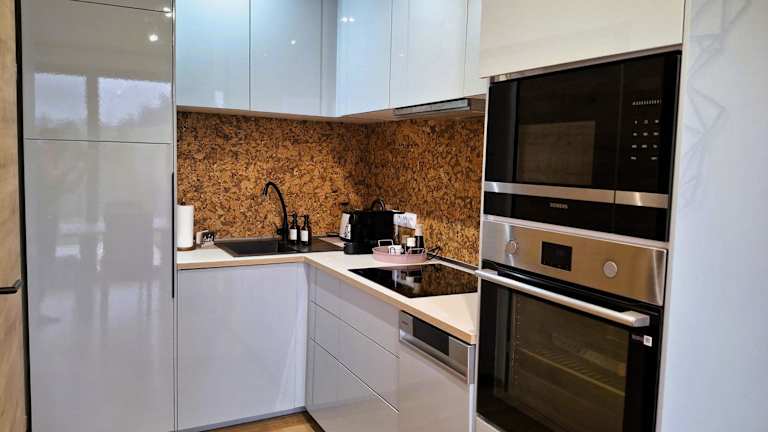 Die gut ausgestattete Küche des Apartments umfasst einen Kühlschrank sowie einen Geschirrspüler, was die Zubereitung von eigenen Mahlzeiten einfach macht. Kaffee kann mit der bereitgestellten Kaffeemaschine genossen werden. Essensmöglichkeiten in der näheren Umgebung sind nicht beschrieben.