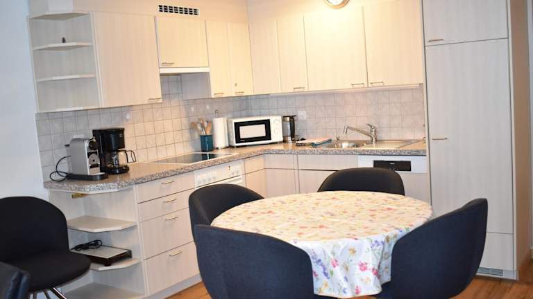 Die Ferienwohnung ist ausgestattet mit 2 Schlafzimmern, einem TV und einer voll ausgestatteten Küche, die einen Kühlschrank, einen Geschirrspüler, eine Waschmaschine und einen Ofen umfasst.