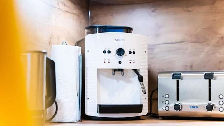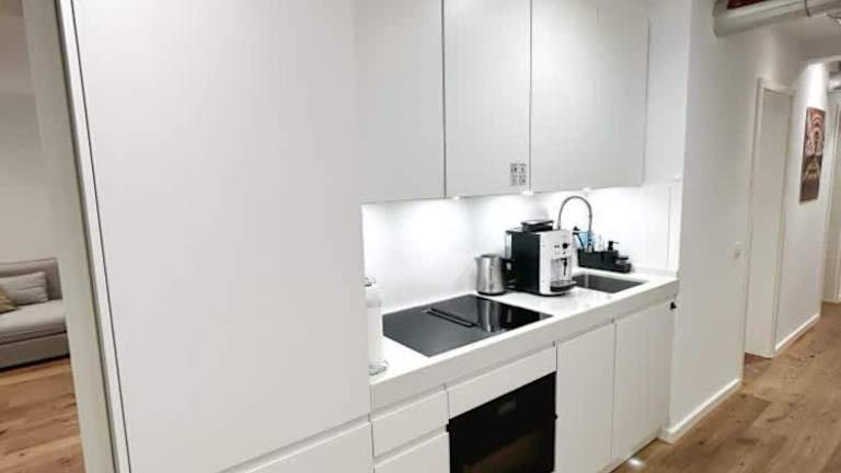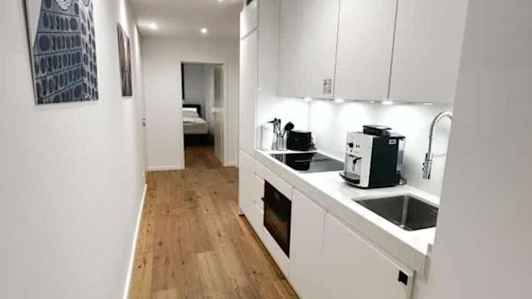 Die Wohnung verfügt über eine Küche, die mit einem Kühlschrank und Geschirrspüler ausgestattet ist, um den Gästen eine bequeme Selbstverpflegung zu ermöglichen. Es sind keine Informationen über Verpflegungsmöglichkeiten wie Restaurant- oder Frühstücksangebote vorhanden.