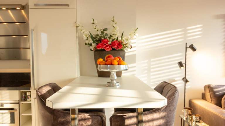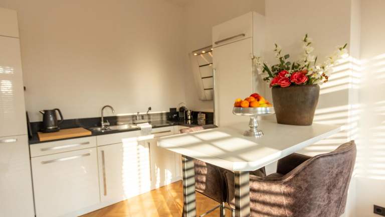 Die Wohnung umfasst ein Schlafzimmer, ein Wohnzimmer, eine voll ausgestattete Küche mit Kühlschrank und Kaffeemaschine sowie ein Badezimmer mit Dusche und Haartrockner. Handtücher und Bettwäsche werden bereitgestellt.