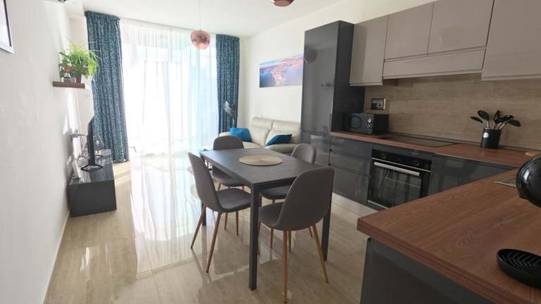 Die Ferienwohnung ist mit einem Schlafzimmer ausgestattet und bietet eine Küche mit Kühlschrank und Geschirrspüler. Sie verfügt über einen Flachbild-TV, einen Sitzbereich und ein Badezimmer mit Dusche. Handtücher und Bettwäsche werden bereitgestellt.