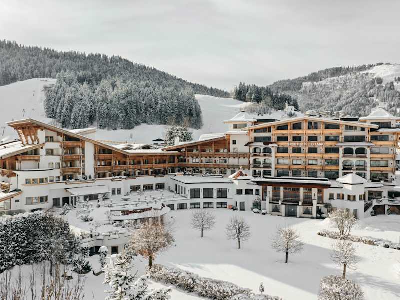 Das Sporthotel Ellmau befindet sich im Ortskern der Gemeinde Ellmau, direkt am Skilift, der ins Skigebiet Wilder Kaiser-Brixental führt. Die Umgebung bietet eine ideale Ausgangslage für Wintersport und Sommeraktivitäten.