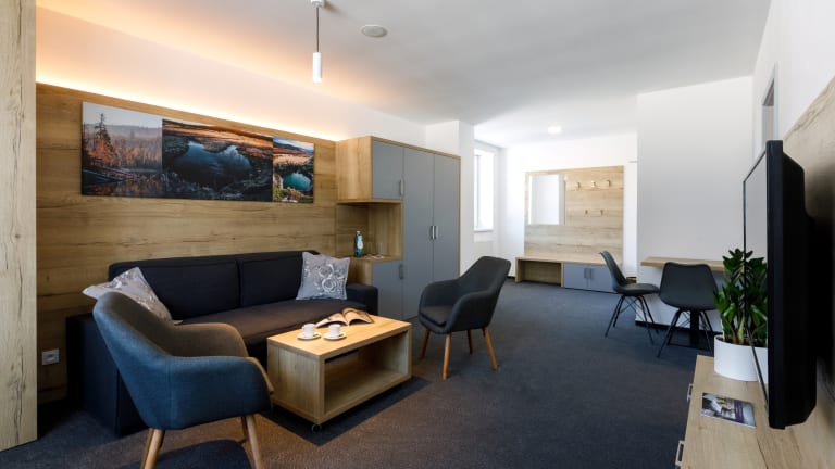 Moderne und komfortable Zimmer, in denen Sie alles finden, um sich während der Erholung oder bei Firmenveranstaltungen perfekt zu entspannen. 48 Zimmer, darunter Familiensuiten, Juniorensuiten oder Doppelzimmer. Die Zimmer sind nach dem Standard eines Vier-Sterne-Hotels für maximalen Komfort ausgestattet.