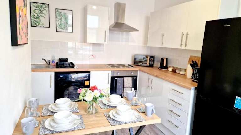 Die Unterkunft verfügt über eine voll ausgestattete Küche mit Kühlschrank, Ofen, Mikrowelle, Toaster und Wasserkocher, sodass Gäste ihre eigenen Mahlzeiten zubereiten können.
