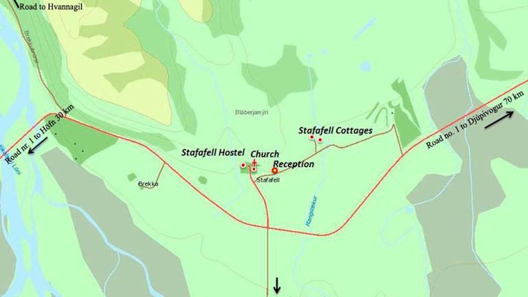 Die Stafafell Cottages befinden sich auf einer Schafzucht im ländlichen Gebiet, 30 km vom Dorf Höfn entfernt. Die Umgebung bietet eine idyllische Landschaft, in der die Gäste die Ruhe der Natur geniessen können. Die Gletscherlagune Jökulsárlón ist 1,5 Autostunden von den Cottages entfernt.