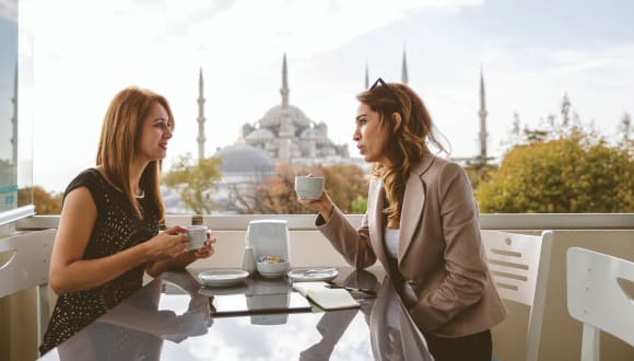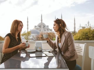 Die gastronomischen Einrichtungen umfassen ein Restaurant, ein Café und eine Bar. Morgens wird ein reichhaltiges Frühstücksbuffet mit regionalen und internationalen Speisen angeboten. Bei Bedarf werden spezielle Kindermenüs zubereitet. Der Frühstücksraum auf der Dachterrasse bietet einen Blick auf das Marmarameer und die Blaue Moschee.