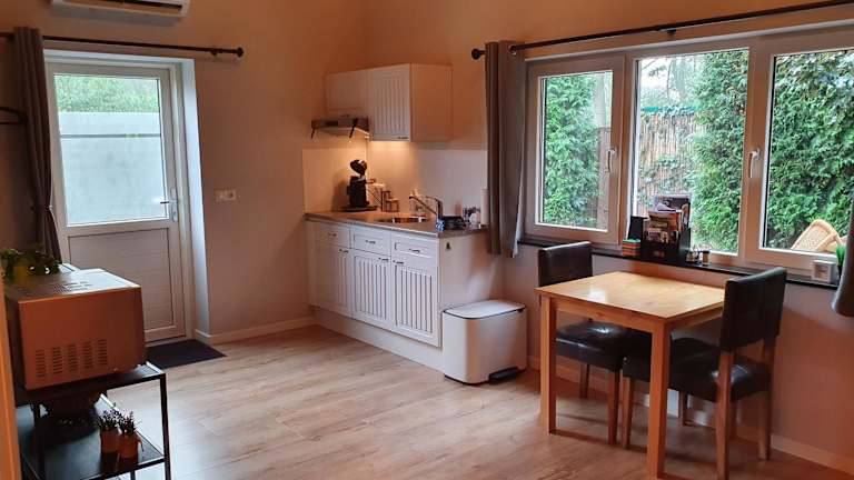 Die Ferienwohnung besteht aus einem Schlafzimmer und einem Wohnzimmer sowie einer voll ausgestatteten Küche, die mit einem Kühlschrank und einer Kaffeemaschine ausgestattet ist. Ein Badezimmer mit Dusche und Haartrockner ist ebenfalls vorhanden. Handtücher und Bettwäsche werden zur Verfügung gestellt, und die Klimaanlage sorgt für ein angenehmes Raumklima.