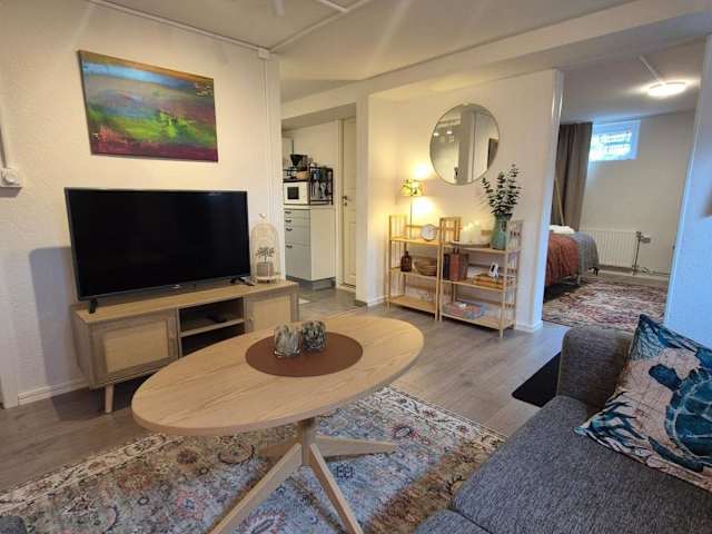 Die Ferienwohnung besteht aus einem Schlafzimmer, einem Wohnzimmer mit einem Flachbild-TV und einer voll ausgestatteten Küche, die über einen Kühlschrank und einen Geschirrspüler verfügt. Zudem gibt es ein Badezimmer mit Dusche. Handtücher und Bettwäsche werden bereitgestellt.