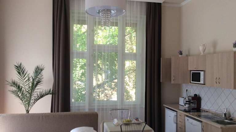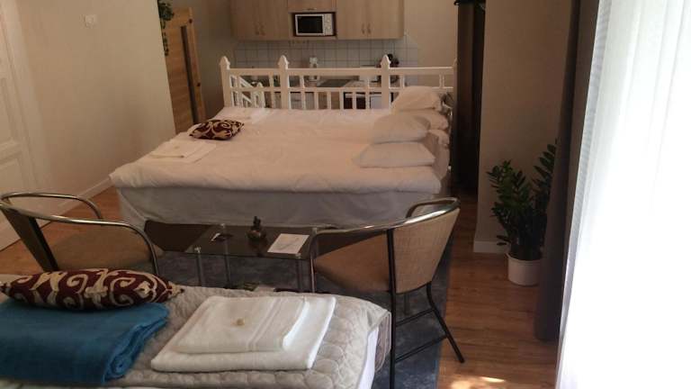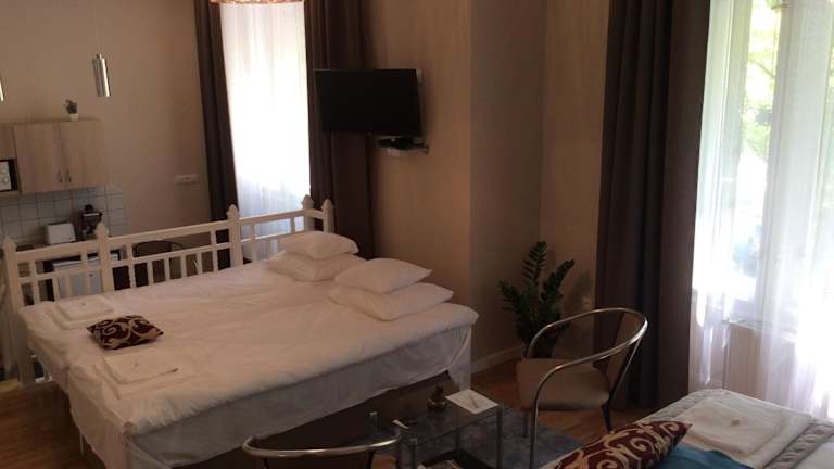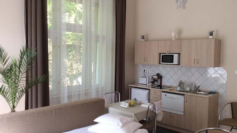 Stefánia Stúdió Apartmanok bietet klimatisierte Wohneinheiten mit kostenloses Wifi und einer Sauna für entspannende Momente. Die Unterkunft ist privat geführt und legt Wert auf Sicherheit und Sauberkeit. Eingeschränkte Feiern, wie Junggesellenabschiede, sind nicht gestattet.